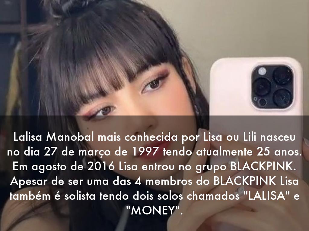 Lalisa Manobal mais conhecida por Lisa ou Lili nasceu no dia 27 de março de 1997 tendo atualmente 25 anos. Em agosto de 2016 Lisa entrou no grupo BLACKPINK. Apesar de ser uma das 4 membros do BLACKPINK Lisa também é solista tendo dois solos chamados "LALISA" e "MONEY".