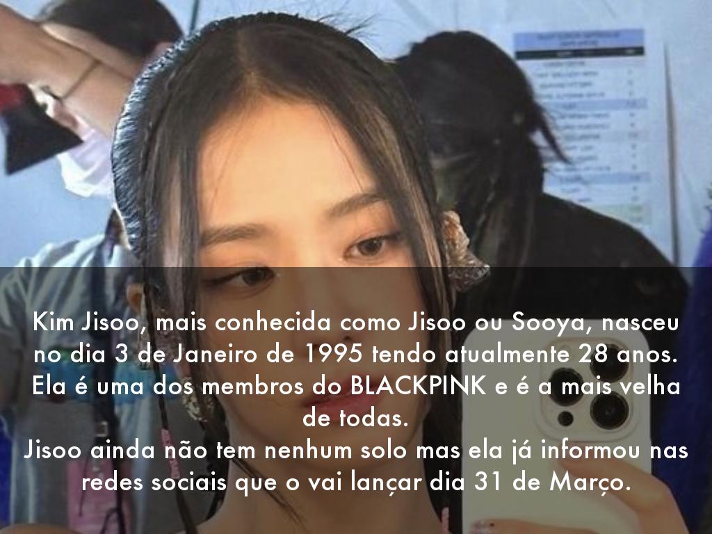 Kim Jisoo, mais conhecida como Jisoo ou Sooya, nasceu no dia 3 de Janeiro de 1995 tendo atualmente 28 anos. Ela é uma dos membros do BLACKPINK e é a mais velha de todas. Jisoo ainda não tem nenhum solo mas ela já informou nas redes sociais que o vai lançar dia 31 de Março.