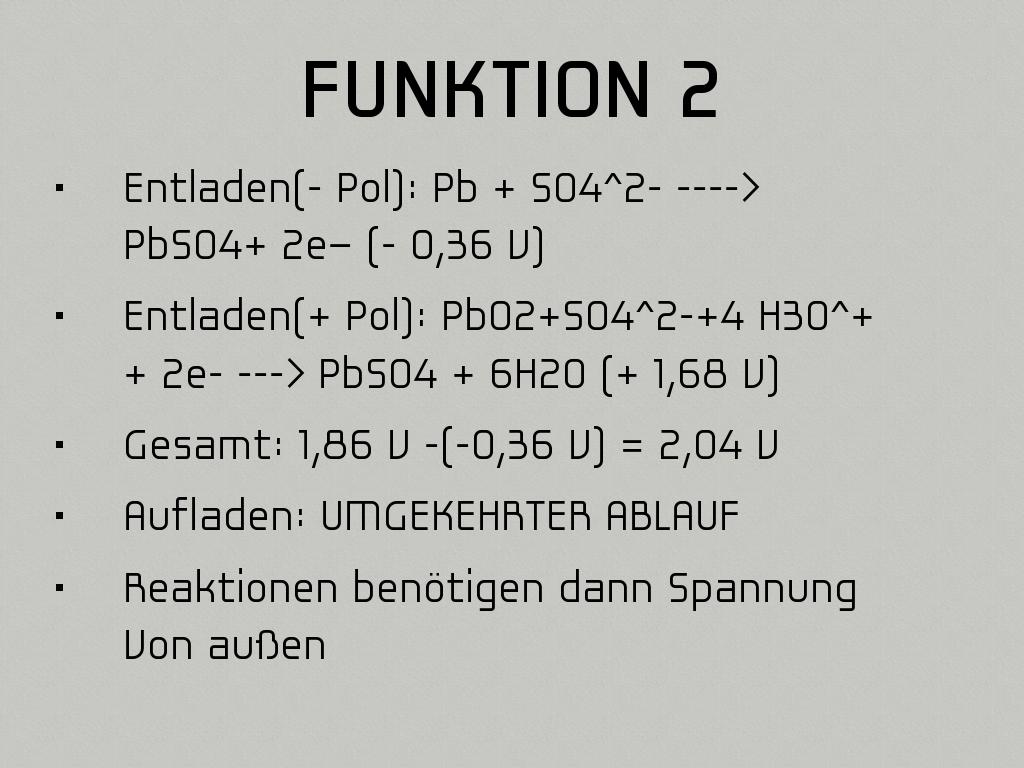 • Entladen(+ Pol): PbO2+SO4^2-+4 H3O^+ + 2e- ---> PbSO4 + 6H2O (+ 1,68 V)