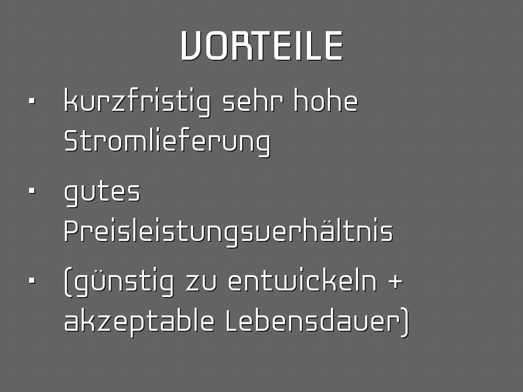 • niedrige Energiedichte im Vergleich. (1/3 eines Nickel-Metallhydrid-Akkus)