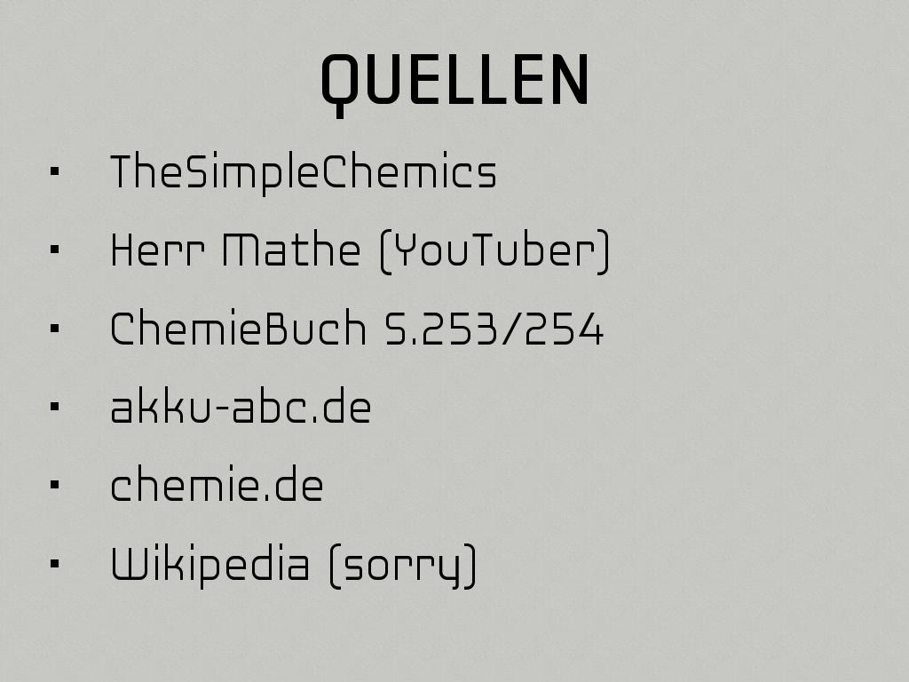 • Entladen(- Pol): Pb + SO4^2- ----> PbSO4+ 2e– (- 0,36 V)