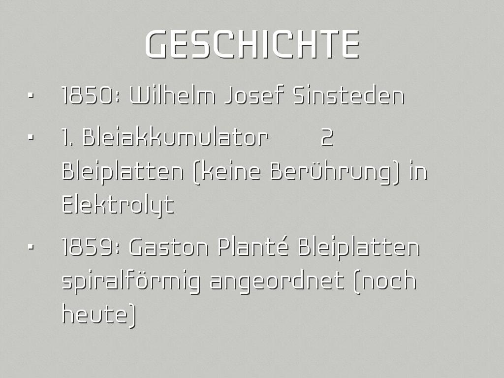 • 1859: Gaston Planté Bleiplatten spiralförmig angeordnet (noch heute)