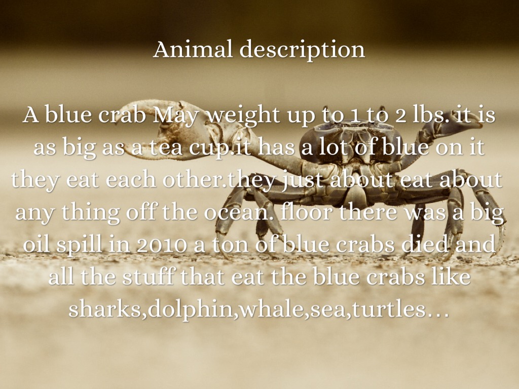 A blue crab May weight up to 1 to 2 lbs. it is as big as a tea cup.it has a lot of blue on it they eat each other.they just about eat about any thing off the ocean. floor there was a big oil spill in 2010 a ton of blue crabs died and all the stuff that eat the blue crabs like sharks,dolphin,whale,sea,turtles