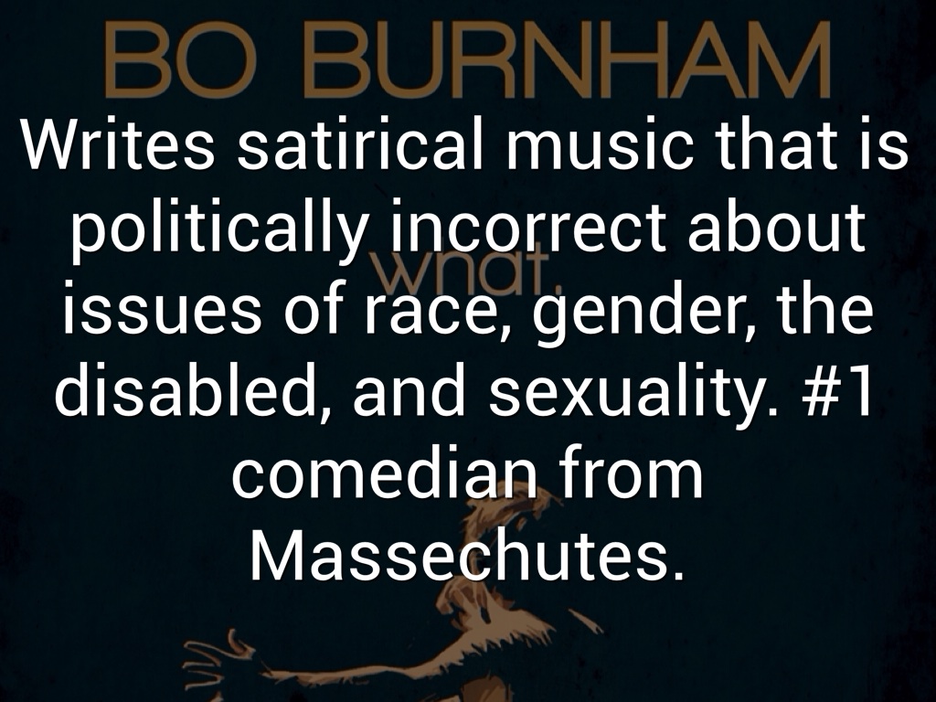 Writes satirical music that is politically incorrect about issues of race, gender, the disabled, and sexuality. #1 comedian from Massechutes.