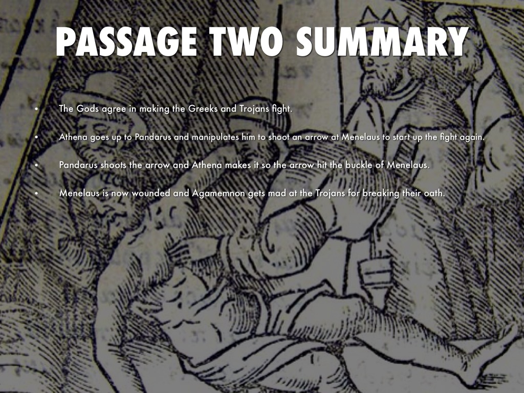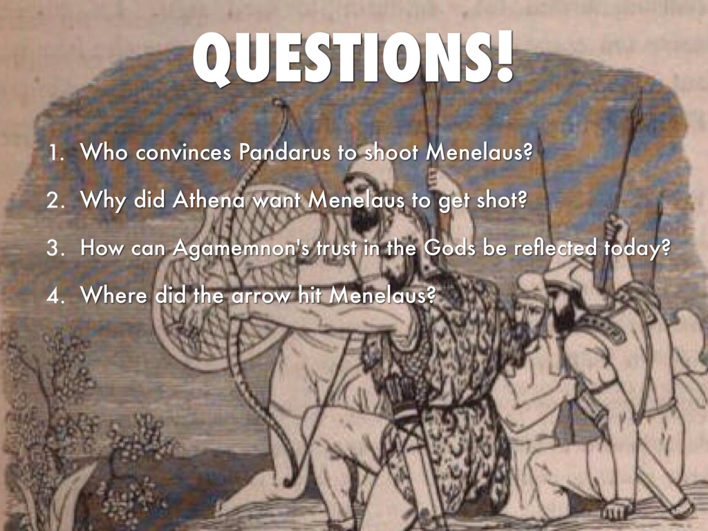 - Athena goes up to Pandarus and manipulates him to shoot an arrow at Menelaus to start up the fight again.