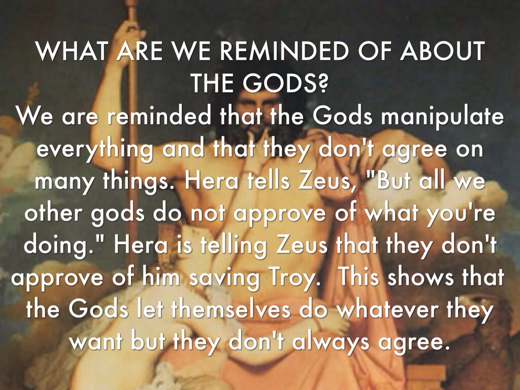 We are reminded that the Gods manipulate everything and that they don't agree on many things. Hera tells Zeus, "But all we other gods do not approve of what you're doing." Hera is telling Zeus that they don't approve of him saving Troy. This shows that the Gods let themselves do whatever they want but they don't always agree.