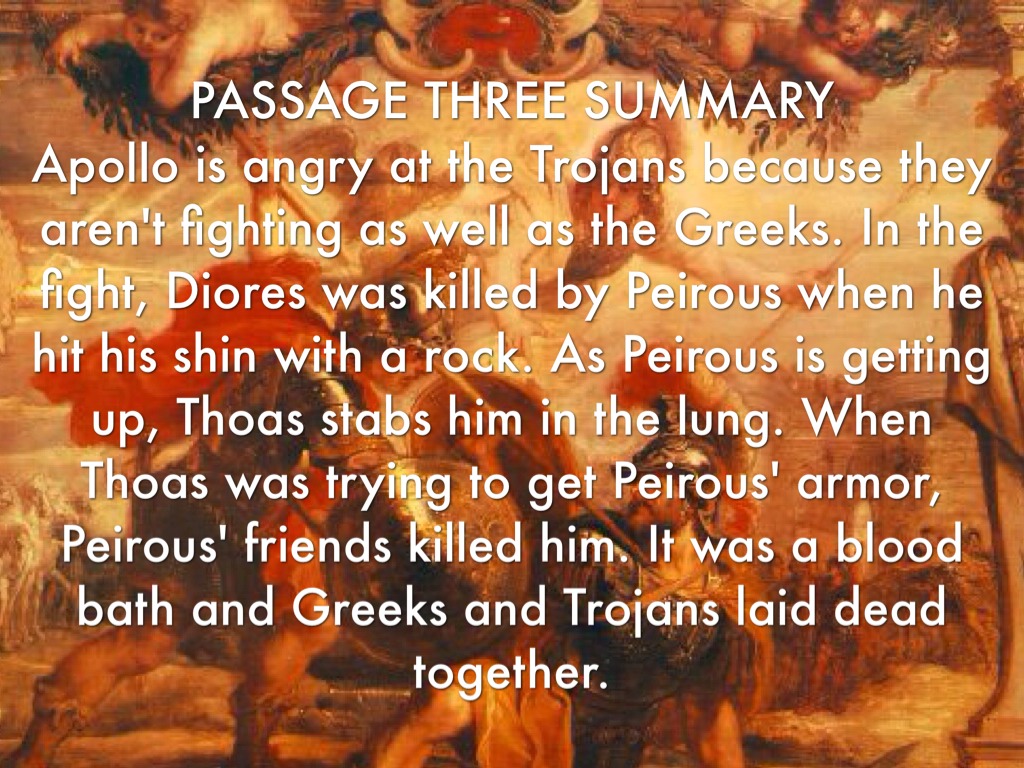 Apollo is angry at the Trojans because they aren't fighting as well as the Greeks. In the fight, Diores was killed by Peirous when he hit his shin with a rock. As Peirous is getting up, Thoas stabs him in the lung. When Thoas was trying to get Peirous' armor, Peirous' friends killed him. It was a blood bath and Greeks and Trojans laid dead together.