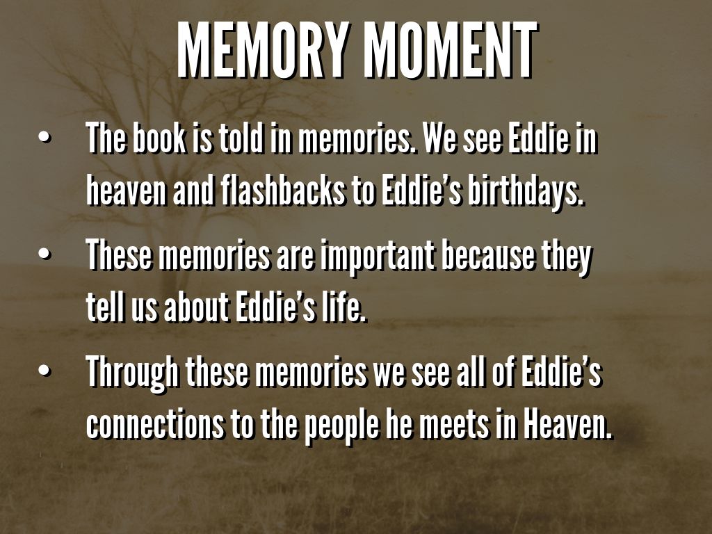 The book is told in memories. We see Eddie in heaven and flashbacks to Eddie's birthdays.