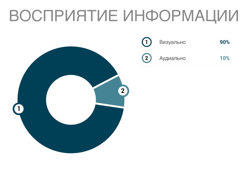 В ходе психологических экспериментов было доказано, что зрительные анализаторы обладают более высокой пропускной способностью, чем слуховые: 90% процентов всей информации, воспринимаемой человеком, приходится именно на зрение. Глаз способен воспринимать миллионы бит в секунду, ухо — только десятки тысяч. К тому же, данные, воспринятые с помощью глаз, более осмысленны и лучше сохраняются в памяти. Не зря говорят: «Лучше один раз увидеть, чем сто раз услышать». Зато усваивается и запоминается лучше информация, которая была получена при непосредственном участии человека в процессе (опыт, эксперимент, практика и проч.).