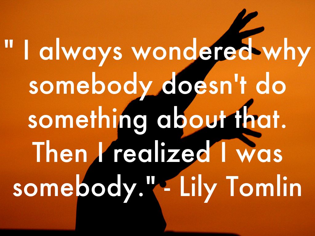 " I always wondered why somebody doesn't do something about that. Then I realized I was somebody." - Lily Tomlin