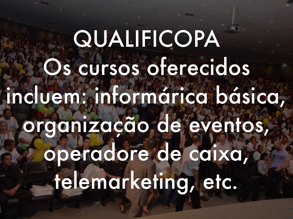Os cursos oferecidos incluem: informárica básica, organização de eventos, operadore de caixa, telemarketing, etc.