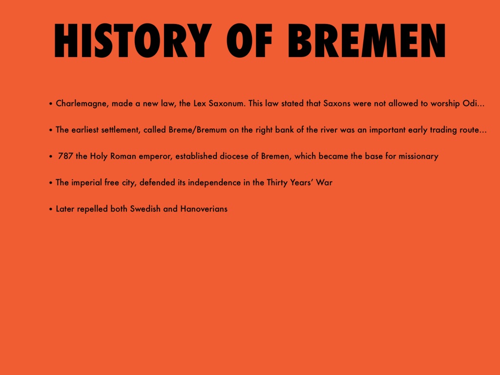 • The earliest settlement, called Breme/Bremum on the right bank of the river was an important early trading route from the Rhine River to the Elbe and from the North Sea to southern Germany
