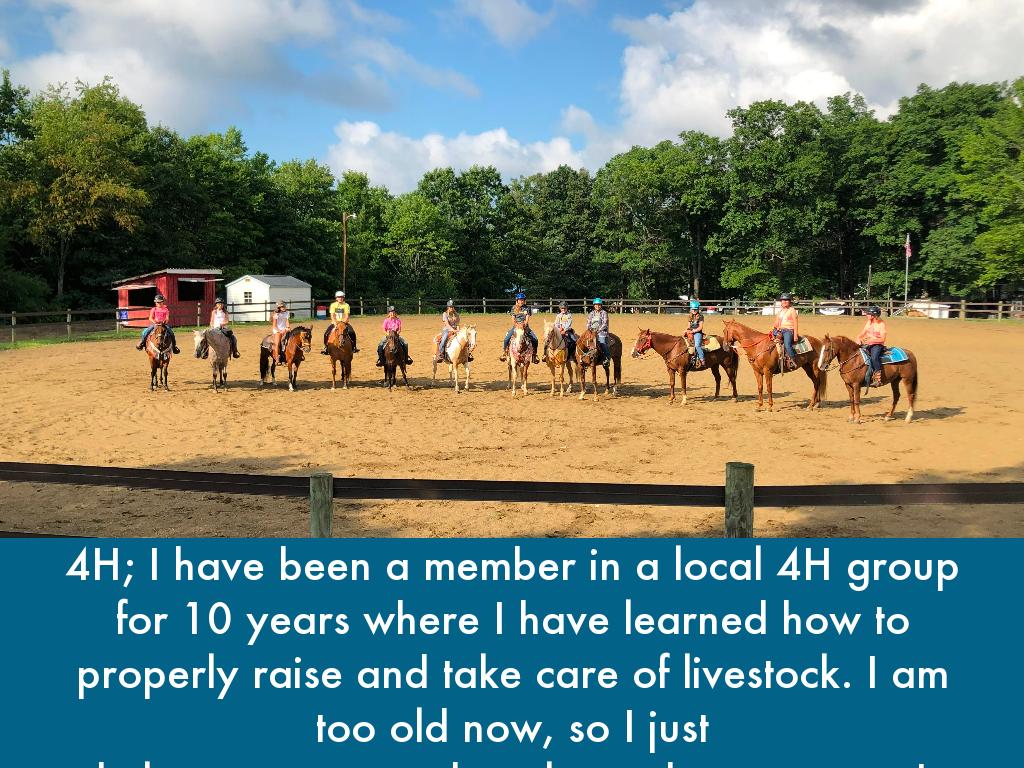 4H; I have been a member in a local 4H group for 10 years where I have learned how to properly raise and take care of livestock. I am too old now, so I just