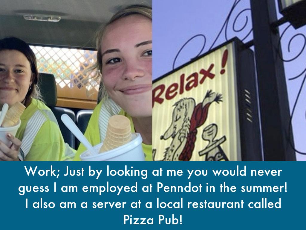 Work; Just by looking at me you would never guess I am employed at Penndot in the summer! I also am a server at a local restaurant called Pizza Pub!