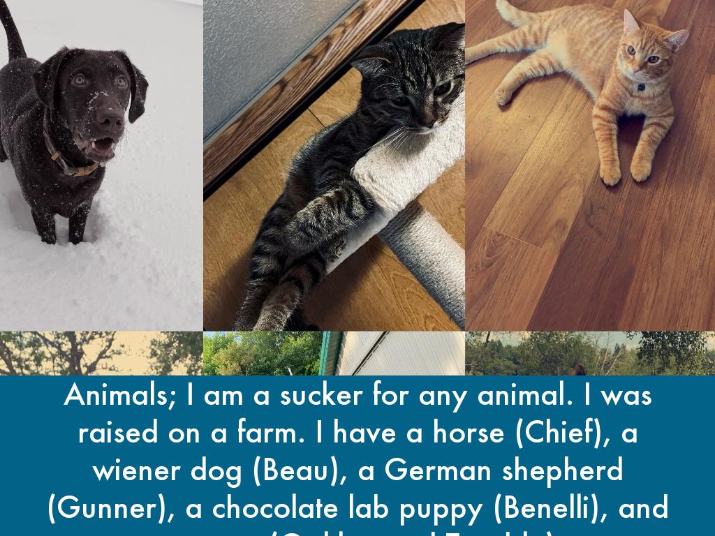 Animals; I am a sucker for any animal. I was raised on a farm. I have a horse (Chief), a wiener dog (Beau), a German shepherd (Gunner), a chocolate lab puppy (Benelli), and two cats (Oakley and Trouble).