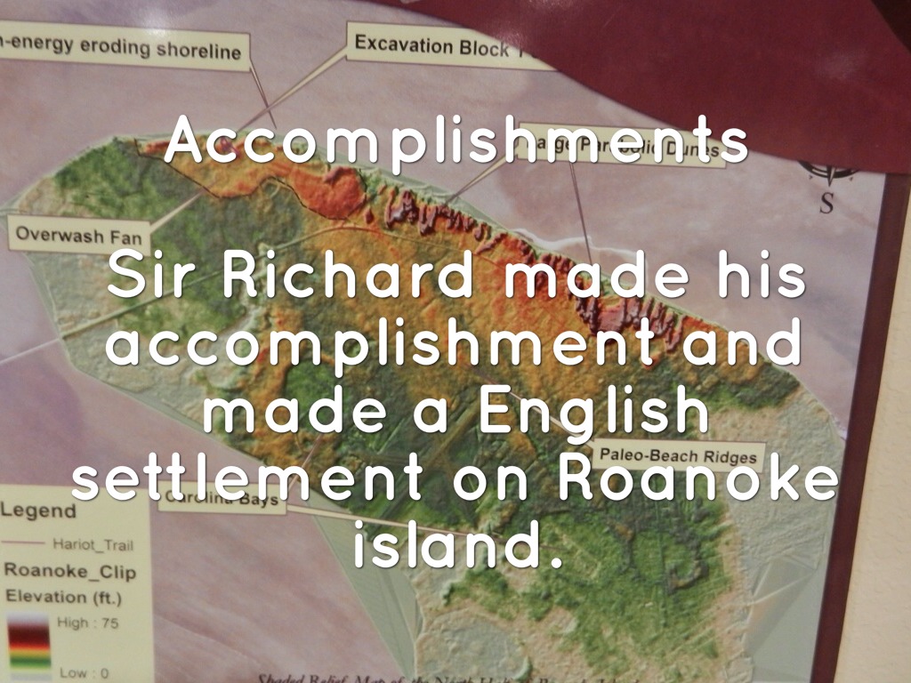 Sir Richard made his accomplishment and made a English settlement on Roanoke island.