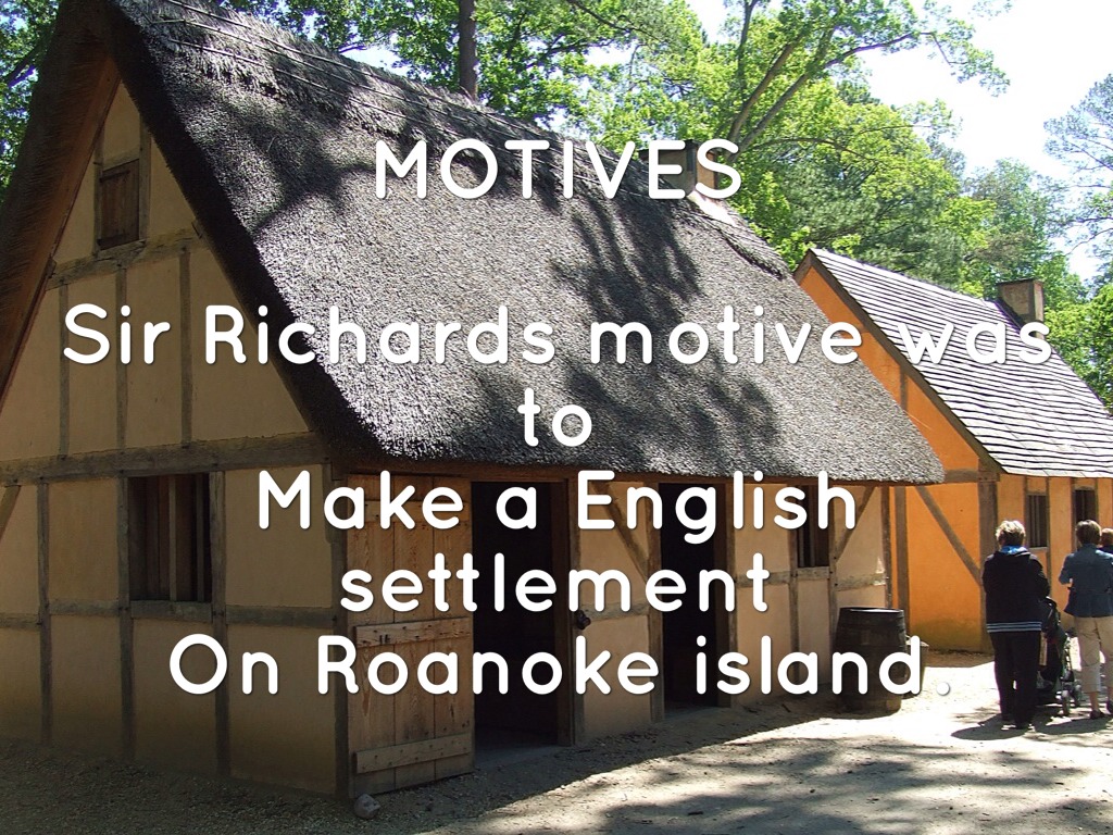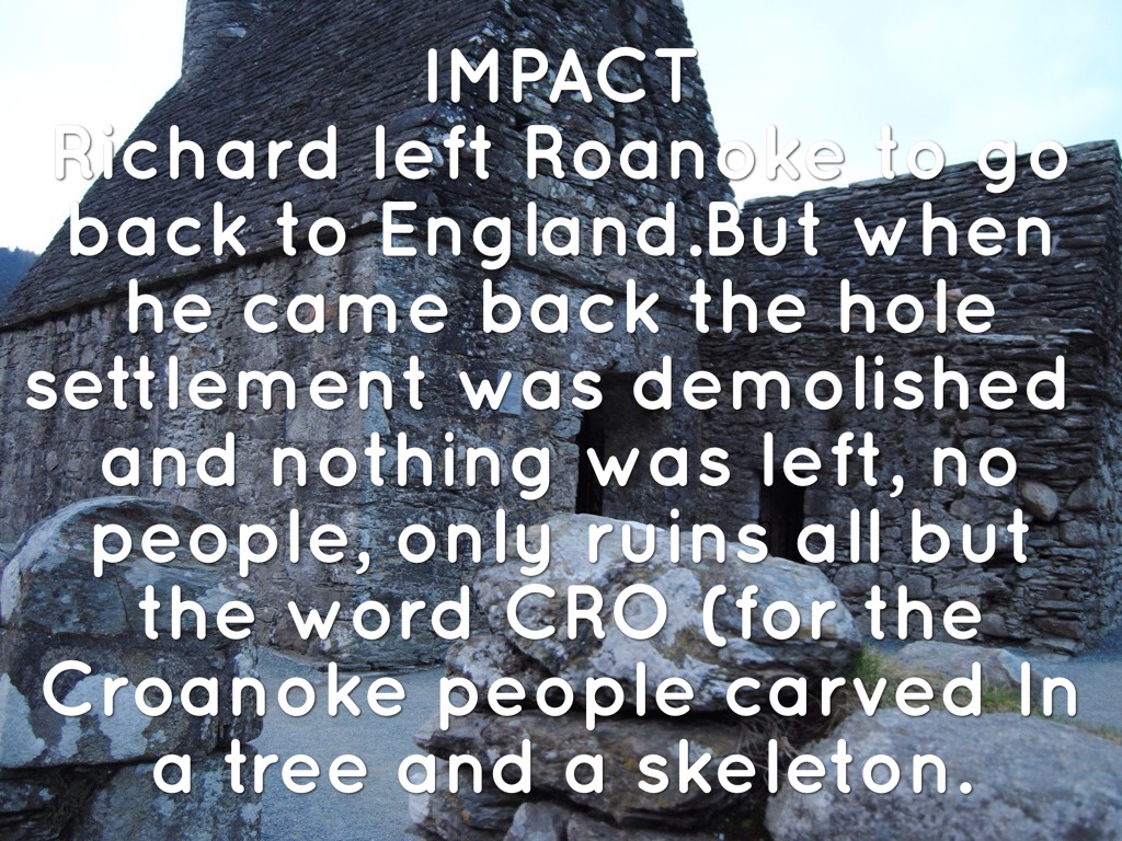 Richard left Roanoke to go back to England.But when he came back the hole settlement was demolished and nothing was left, no people, only ruins all but the word CRO (for the Croanoke people carved In a tree and a skeleton.
