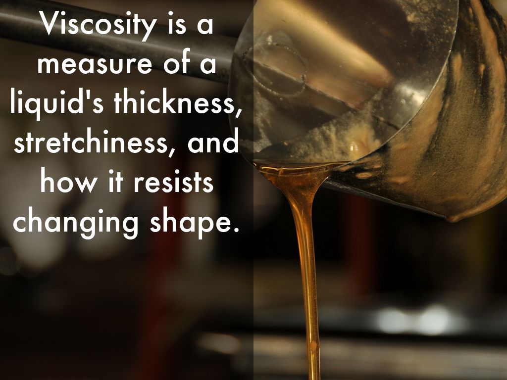 Viscosity is a measure of a liquid's thickness, stretchiness, and how it resists changing shape.