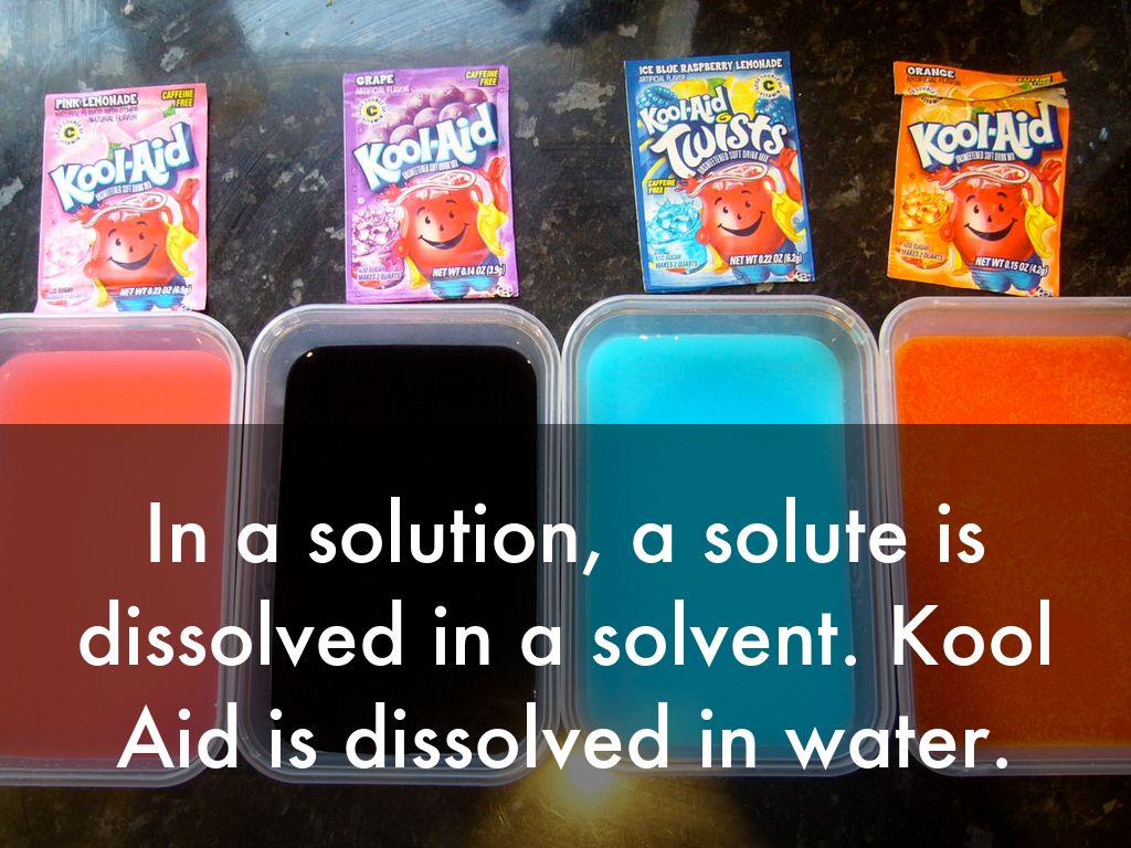In a solution, a solute is dissolved in a solvent. Kool Aid is dissolved in water.