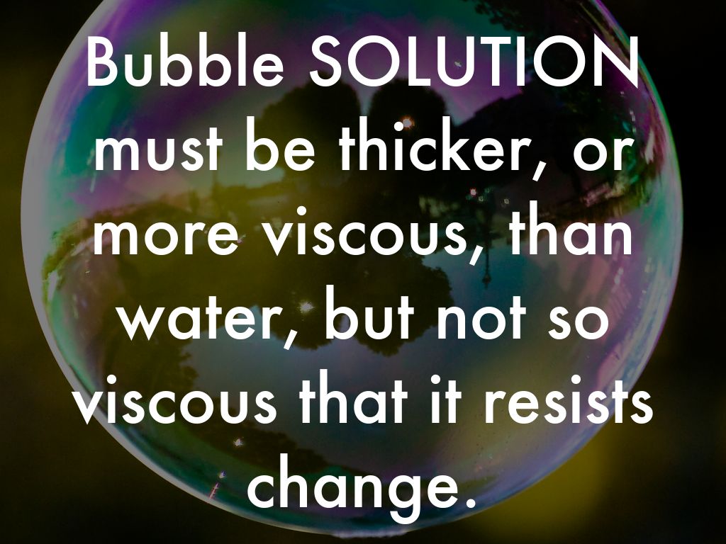 Bubble SOLUTION must be thicker, or more viscous, than water, but not so viscous that it resists change.