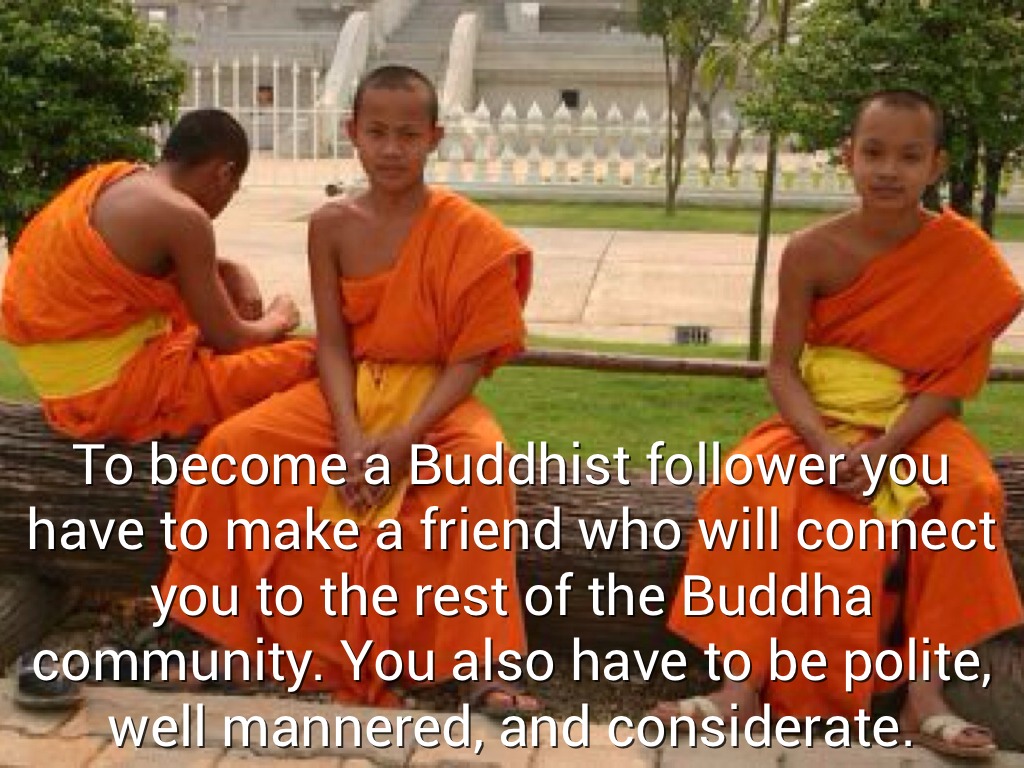 To become a Buddhist follower you have to make a friend who will connect you to the rest of the Buddha community. You also have to be polite, well mannered, and considerate.