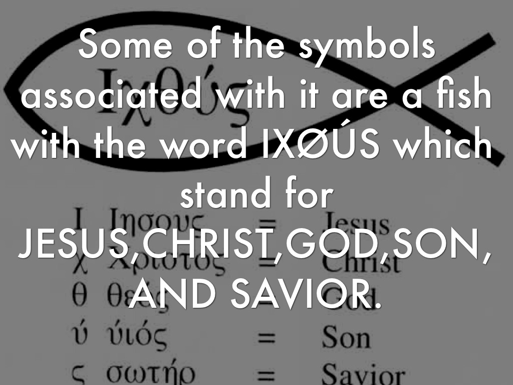 Some of the symbols associated with it are a fish with the word IXØÚS which stand for JESUS,CHRIST,GOD,SON,AND SAVIOR.