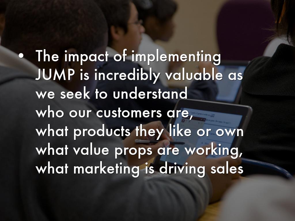 The impact of implementing JUMP is incredibly valuable as we seek to understand who our customers are, what products they like or own what value props are working, what marketing is driving sales