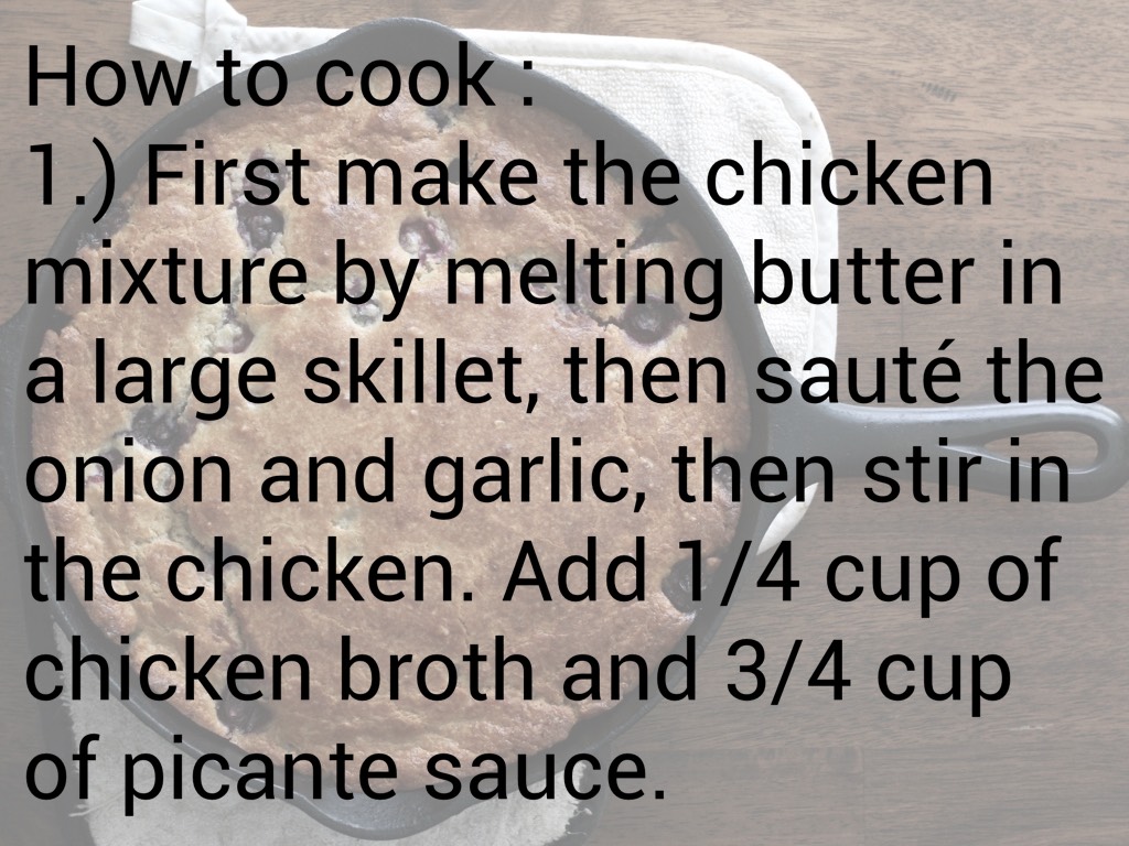 How to cook : 1.) First make the chicken mixture by melting butter in a large skillet, then sauté the onion and garlic, then stir in the chicken. Add 1/4 cup of chicken broth and 3/4 cup of picante sauce.