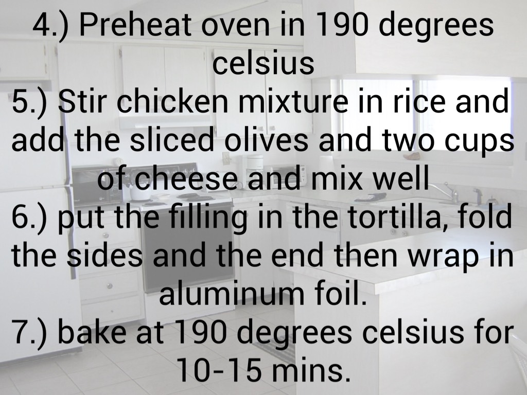 4.) Preheat oven in 190 degrees celsius 5.) Stir chicken mixture in rice and add the sliced olives and two cups of cheese and mix well 6.) put the filling in the tortilla, fold the sides and the end then wrap in aluminum foil. 7.) bake at 190 degrees celsius for 10-15 mins.