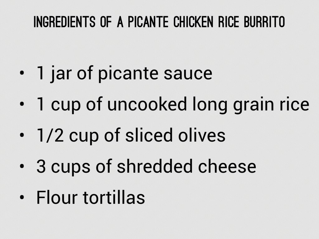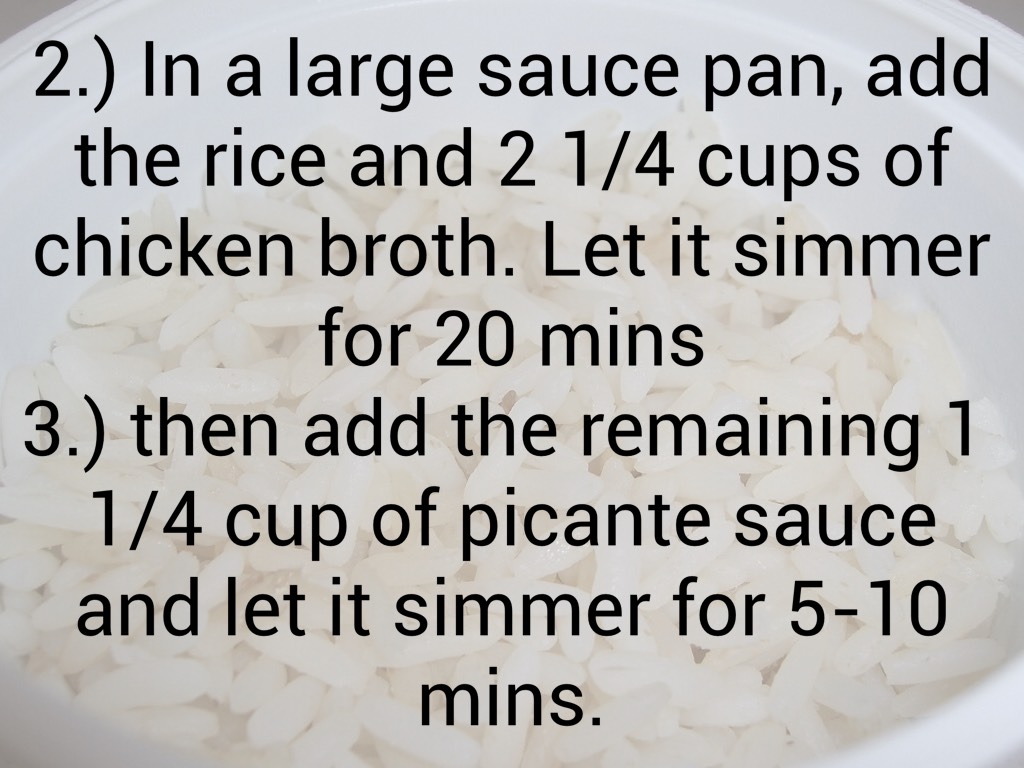 2.) In a large sauce pan, add the rice and 2 1/4 cups of chicken broth. Let it simmer for 20 mins 3.) then add the remaining 1 1/4 cup of picante sauce and let it simmer for 5-10 mins.