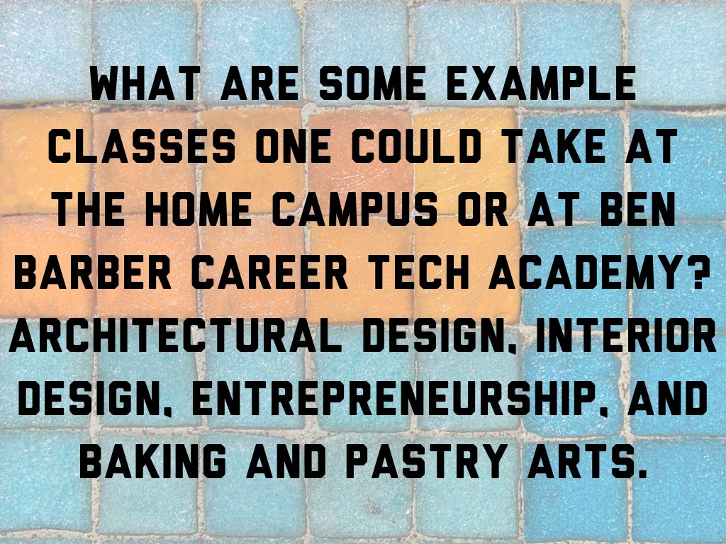 What are some example classes one could take at the home campus or at Ben barber career tech academy? Architectural design, interior design, entrepreneurship, and baking and pastry arts.