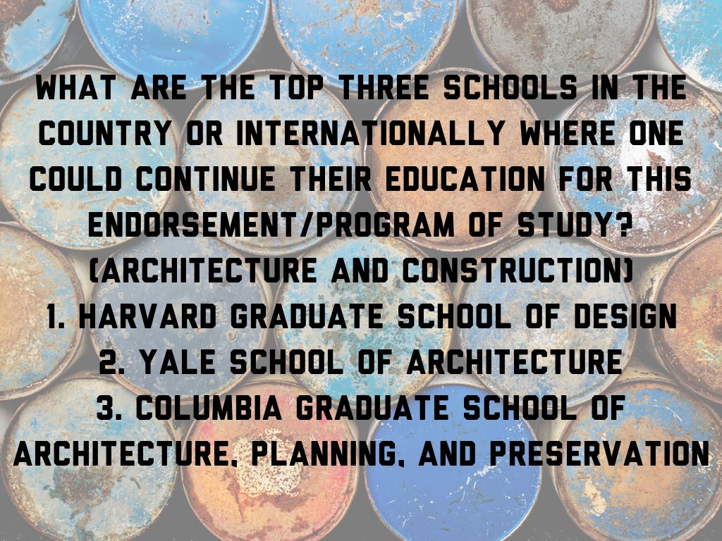 WHAT ARE THE TOP THREE SCHOOLS IN THE COUNTRY OR INTERNATIONALLY WHERE ONE COULD CONTINUE THEIR EDUCATION FOR THIS ENDORSEMENT/PROGRAM OF STUDY? (Architecture and construction) 1. Harvard graduate school of design 2. Yale school of architecture 3. Columbia graduate school of architecture, planning, and preservation