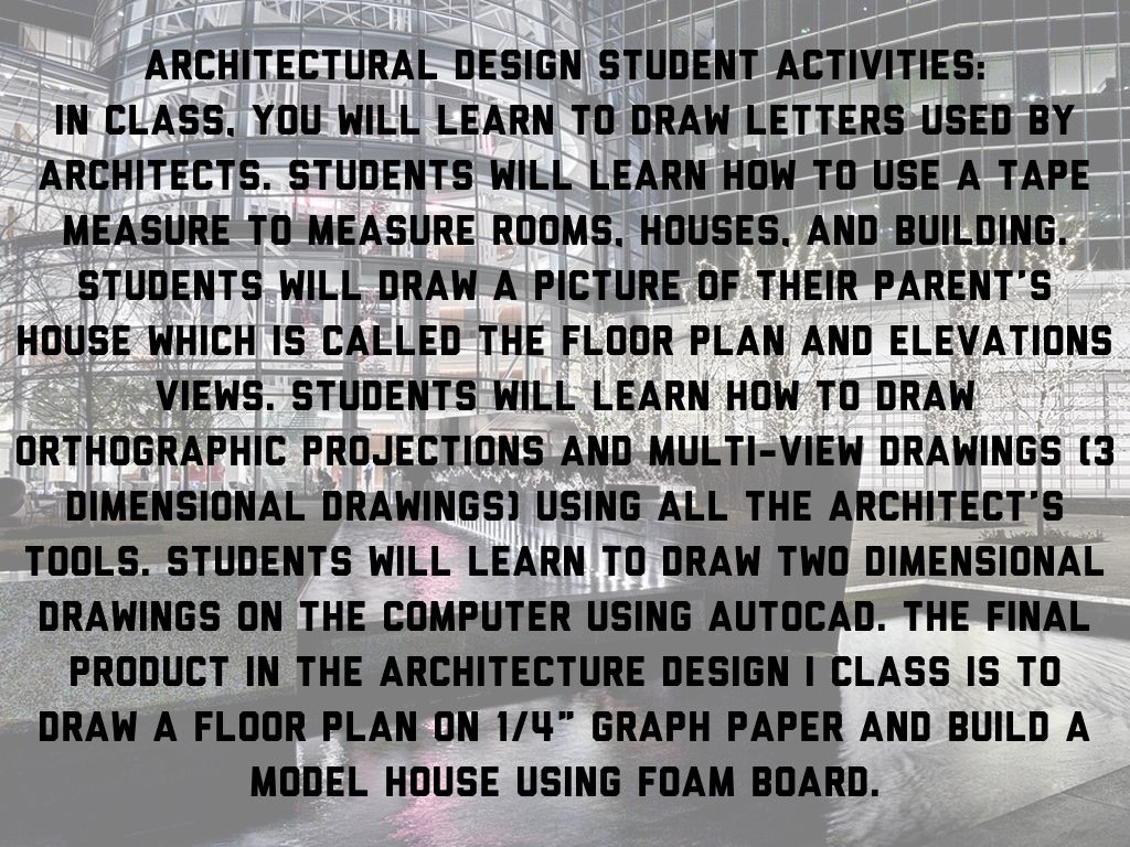 Architectural design student activities: In class, you will learn to draw letters used by Architects. Students will learn how to use a tape measure to measure rooms, houses, and building. Students will draw a picture of their parent’s house which is called the floor plan and elevations views. Students will learn how to draw orthographic projections and multi-view drawings (3 dimensional drawings) using all the architect’s tools. Students will learn to draw two dimensional drawings on the computer using AutoCAD. The final product in the Architecture Design I class is to draw a floor plan on 1⁄4” graph paper and build a model house using foam board.