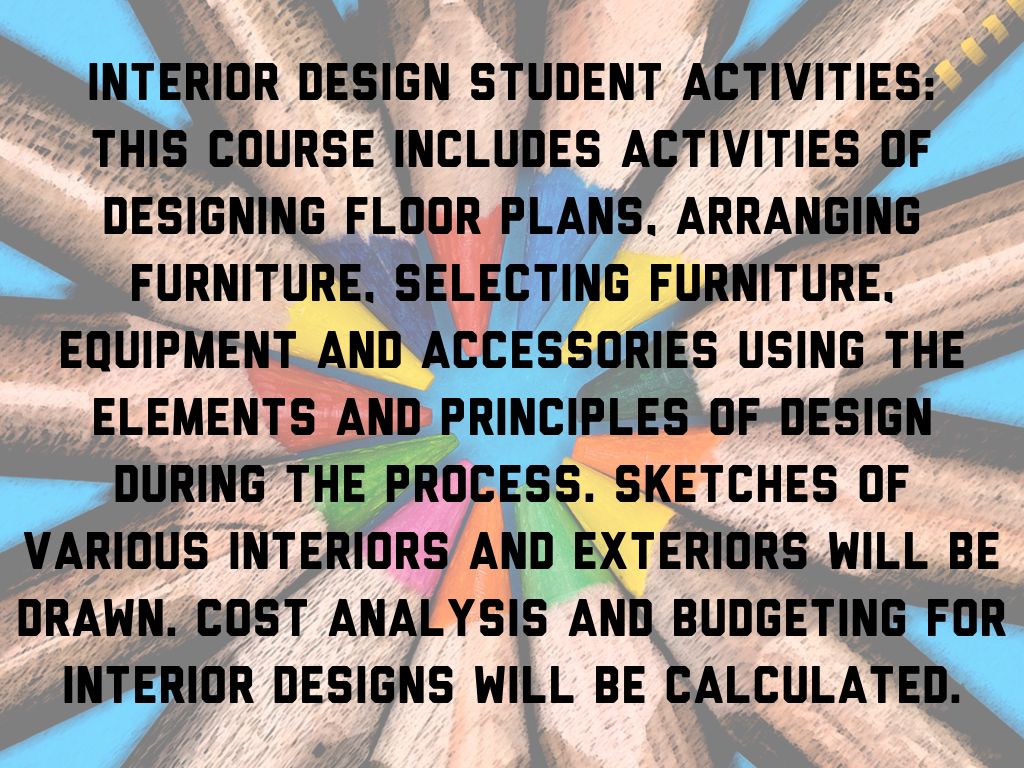 Interior design student activities: This course includes activities of designing floor plans, arranging furniture, selecting furniture, equipment and accessories using the elements and principles of design during the process. Sketches of various interiors and exteriors will be drawn. Cost analysis and budgeting for interior designs will be calculated.