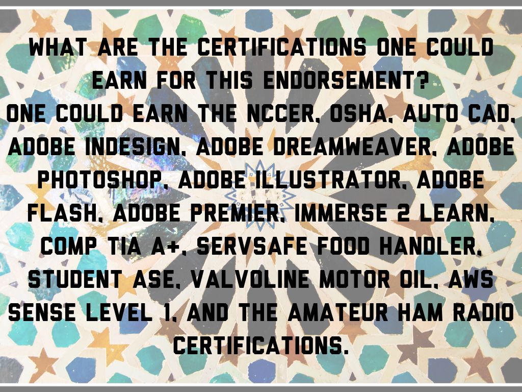 What are the certifications one could earn for this endorsement? One could earn the Nccer, osha, auto cad, Adobe indesign, Adobe dreamweaver, Adobe Photoshop, Adobe illustrator, Adobe flash, Adobe premier, immerse 2 learn, comp tia a+, servsafe food handler, student Ase, valvoline motor oil, aws sense level 1, and the amateur ham radio certifications.