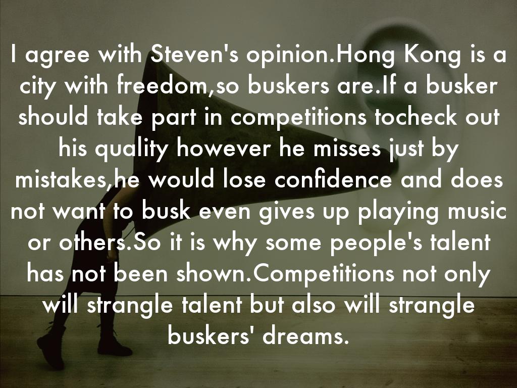 I agree with Steven's opinion.Hong Kong is a city with freedom,so buskers are.If a busker should take part in competitions tocheck out his quality however he misses just by mistakes,he would lose confidence and does not want to busk even gives up playing music or others.So it is why some people's talent has not been shown.Competitions not only will strangle talent but also will strangle buskers' dreams.