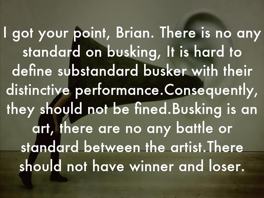 I got your point, Brian. There is no any standard on busking, It is hard to define substandard busker with their distinctive performance.Consequently, they should not be fined.Busking is an art, there are no any battle or standard between the artist.There should not have winner and loser.