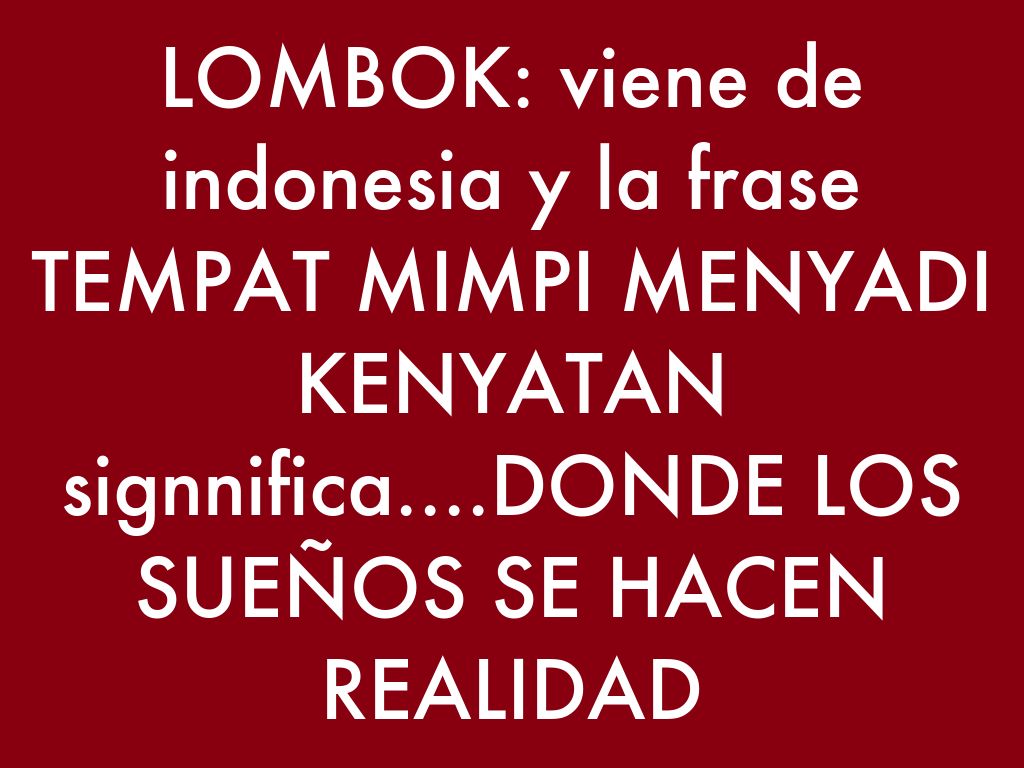 LOMBOK: viene de indonesia y la frase TEMPAT MIMPI MENYADI KENYATAN signnifica....DONDE LOS SUEÑOS SE HACEN REALIDAD
