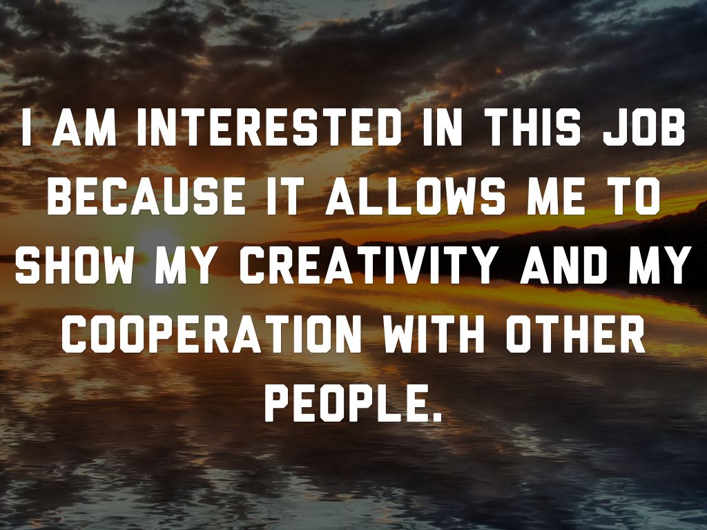 I am interested in this job because it allows me to show my creativity and my cooperation with other people.
