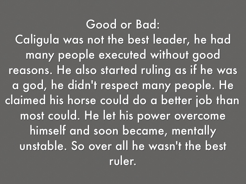 Caligula was not the best leader, he had many people executed without good reasons. He also started ruling as if he was a god, he didn't respect many people. He claimed his horse could do a better job than most could. He let his power overcome himself and soon became, mentally unstable. So over all he wasn't the best ruler.