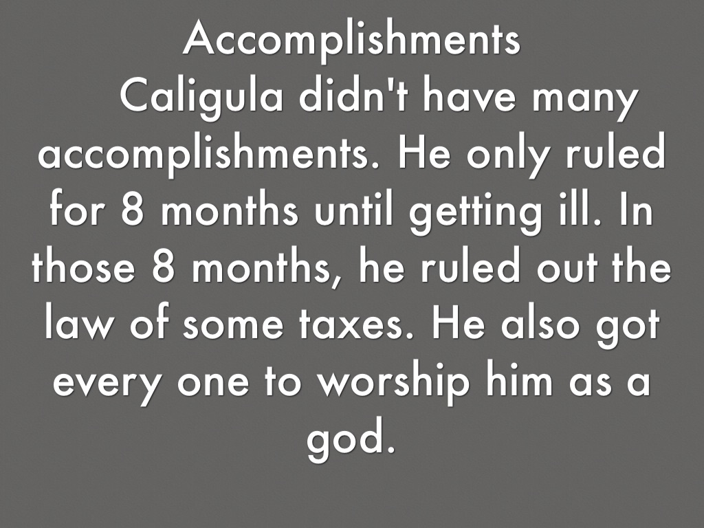 Caligula didn't have many accomplishments. He only ruled for 8 months until getting ill. In those 8 months, he ruled out the law of some taxes. He also got every one to worship him as a god.