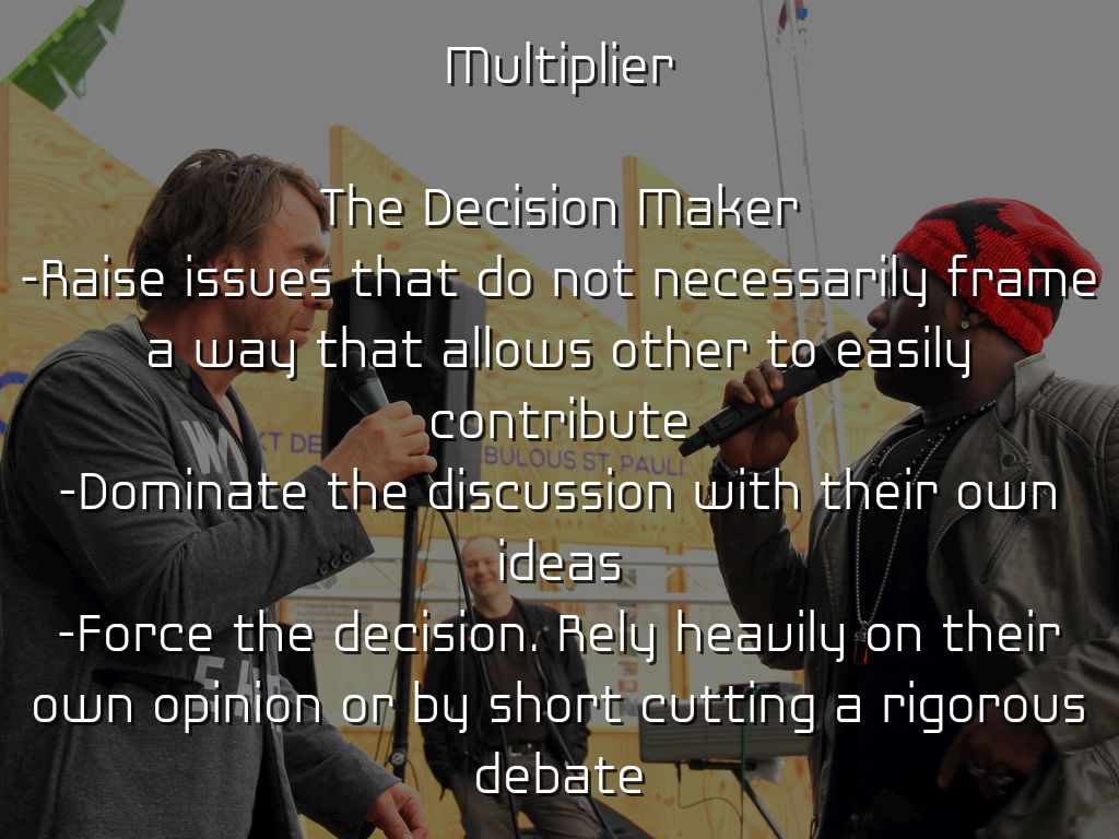 The Decision Maker -Raise issues that do not necessarily frame a way that allows other to easily contribute -Dominate the discussion with their own ideas -Force the decision. Rely heavily on their own opinion or by short cutting a rigorous debate
