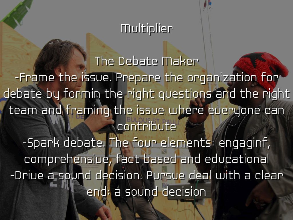 The Debate Maker -Frame the issue. Prepare the organization for debate by formin the right questions and the right team and framing the issue where everyone can contribute -Spark debate. The four elements: engaginf, comprehensive, fact based and educational -Drive a sound decision. Pursue deal with a clear end: a sound decision