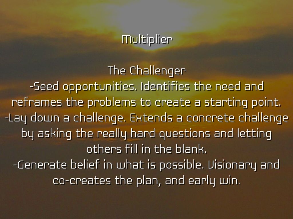 The Challenger -Seed opportunities. Identifies the need and reframes the problems to create a starting point. -Lay down a challenge. Extends a concrete challenge by asking the really hard questions and letting others fill in the blank. -Generate belief in what is possible. Visionary and co-creates the plan, and early win.