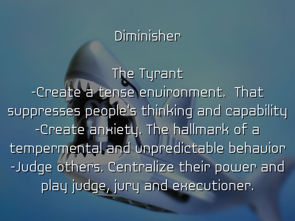 The Tyrant -Create a tense environment. That suppresses people's thinking and capability -Create anxiety. The hallmark of a tempermental and unpredictable behavior -Judge others. Centralize their power and play judge, jury and executioner.