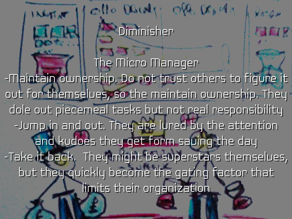 The Micro Manager -Maintain ownership. Do not trust others to figure it out for themselves, so the maintain ownership. They dole out piecemeal tasks but not real responsibility -Jump in and out. They are lured by the attention and kudoes they get form saving the day -Take it back. They might be superstars themselves, but they quickly become the gating factor that limits their organization