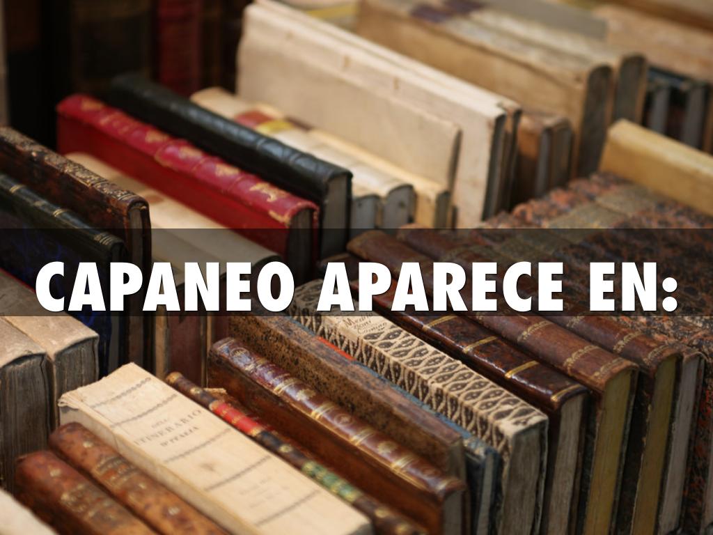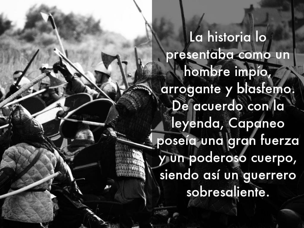 La historia lo presentaba como un hombre impío, arrogante y blasfemo. De acuerdo con la leyenda, Capaneo poseía una gran fuerza y un poderoso cuerpo, siendo así un guerrero sobresaliente.