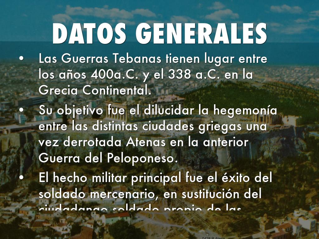 - Las Guerras Tebanas tienen lugar entre los años 400a.C. y el 338 a.C. en la Grecia Continental.