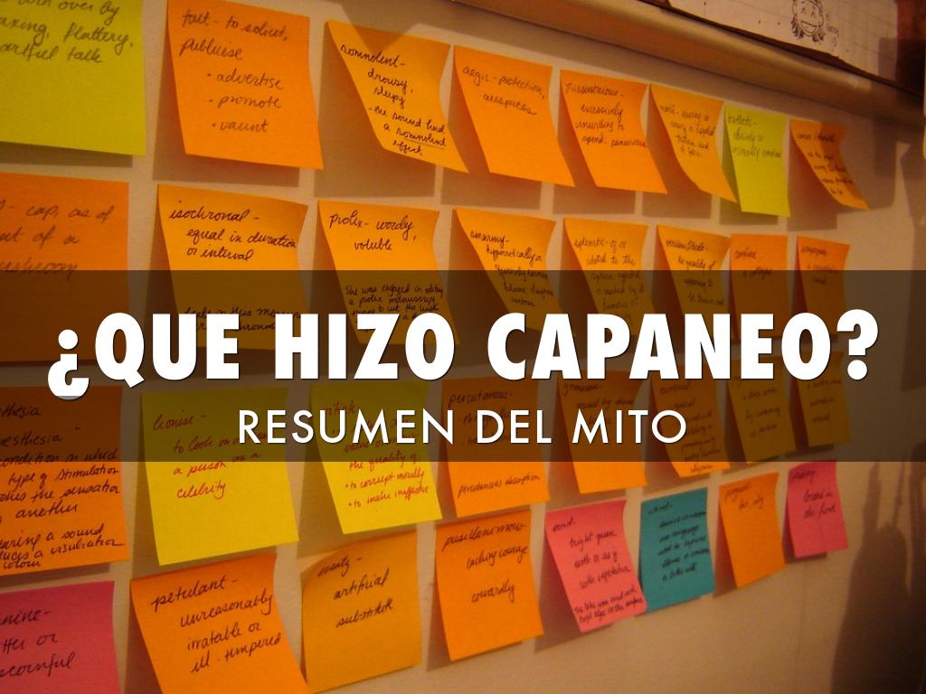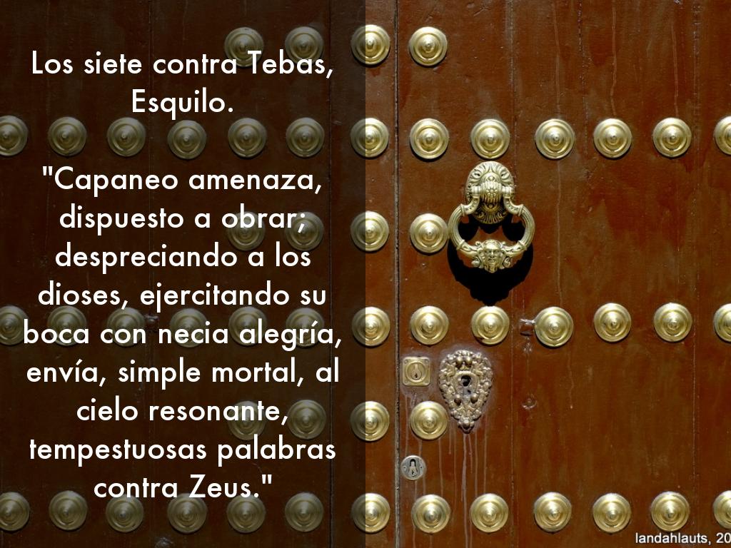 "Capaneo amenaza, dispuesto a obrar; despreciando a los dioses, ejercitando su boca con necia alegría, envía, simple mortal, al cielo resonante, tempestuosas palabras contra Zeus."