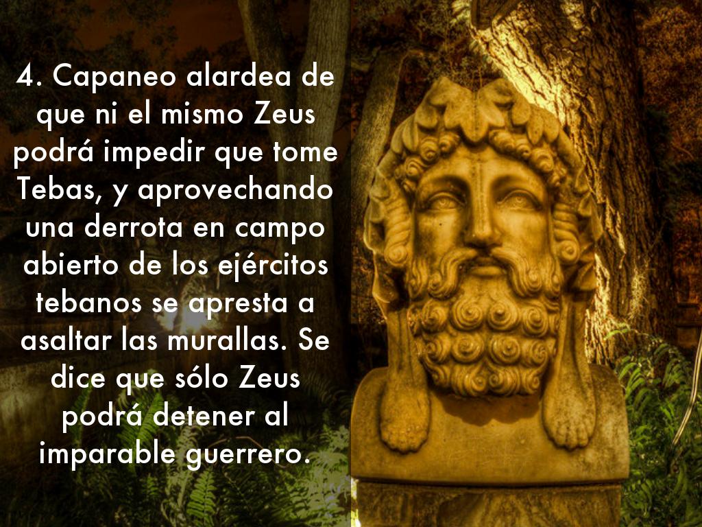 4. Capaneo alardea de que ni el mismo Zeus podrá impedir que tome Tebas, y aprovechando una derrota en campo abierto de los ejércitos tebanos se apresta a asaltar las murallas. Se dice que sólo Zeus podrá detener al imparable guerrero.